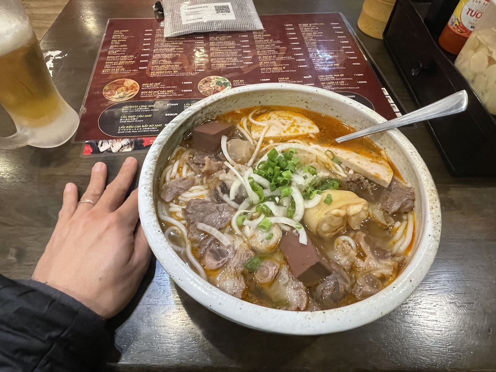 Phần thưởng sau buổi chạy là một tô bún bò khổng lồ cùng 1 ly bia tươi mát lạnh. Đây là tô bún bò ngon nhất mình được ăn từ lúc qua Nhật đến giờ, chất lượng không kém gì khi ăn ở Sài Gòn, chỉ khác là giá mắc gấp 3.