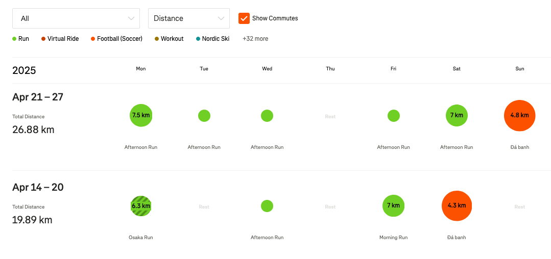 Xen kẽ các buổi chạy ở công viên là các buổi chạy ngắn ở xung quanh nhà, rồi kết thúc tuần bằng 1 buổi đá banh trong nhà. Nhờ việc tăng cường độ và thời lượng chạy bộ trong 1 tháng gần đây mà thể lực trong các trận đá banh của mình đã được cải thiện rõ rệt, không còn bị hụt hơi khi đua tốc độ trên sân nữa.