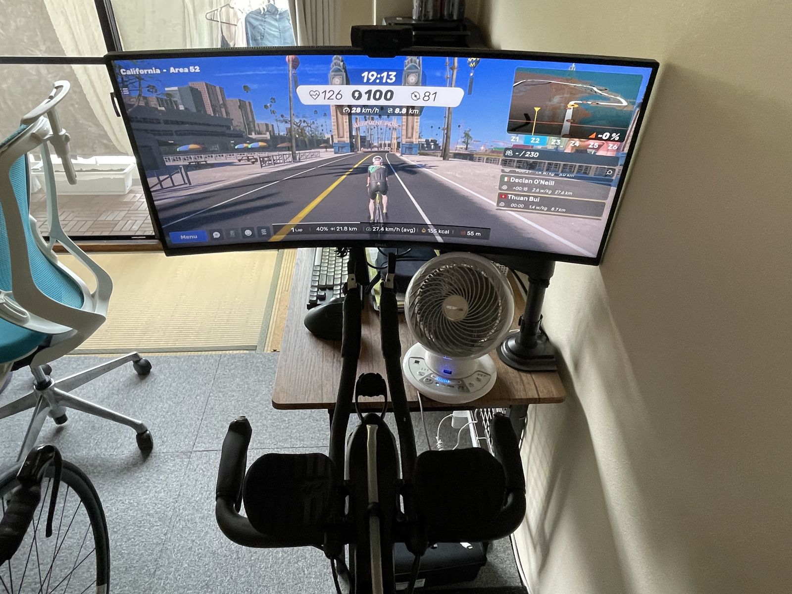 - Bàn máy tính được đặt ngay kế bên khu vực tập luyện. Màn hình máy tính có thể linh hoạt khi làm việc hoặc quay 90 độ để sử dụng khi đạp xe.