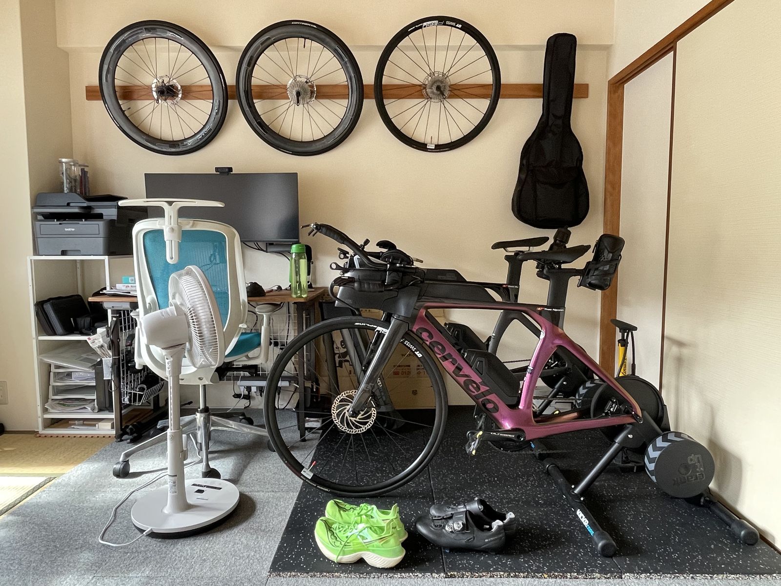 - Chiếc quạt đứng trên sàn tốn diện tích đã được thay bằng một chiếc quạt mini. Quạt mini sẽ được lắp lên bàn mỗi khi đạp xe để làm mát mỗi khi tập.