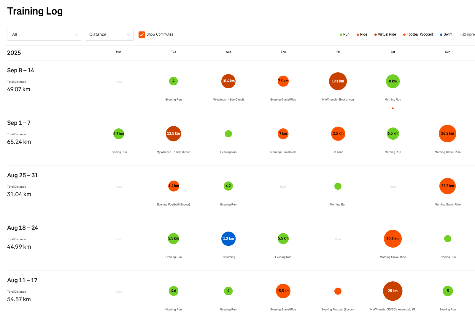 Các buổi chạy bộ, đạp xe vẫn được duy trì đều đặn ở mức độ nhẹ nhàng, thư giãn. Hôm nào trời quá nóng hoặc mưa, mình chuyển qua đạp xe trong nhà.
