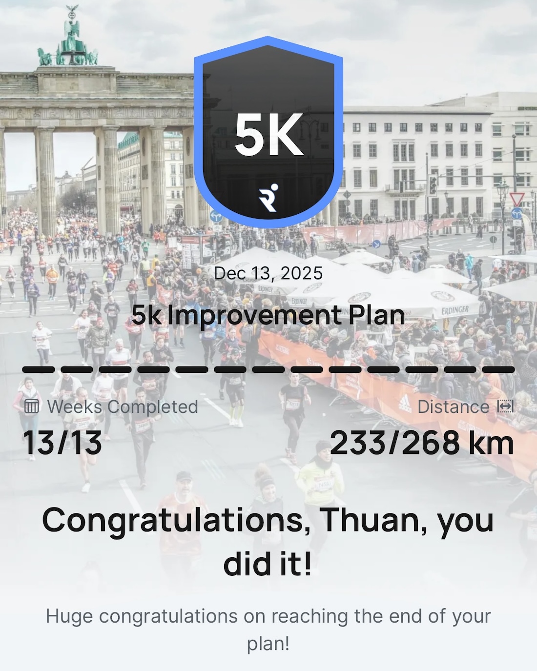 Sau 13 tuần tập luyện chăm chỉ, mình đã hoàn thành chiến dịch 5K 2025, hay còn được gọi là chiến dịch phục hồi nhân phẩm. Đây là cột mốc quan trọng của mình để quay lại guồng tập luyện, sau gần một năm rưỡi ổn định cuộc sống mới ở Nhật.