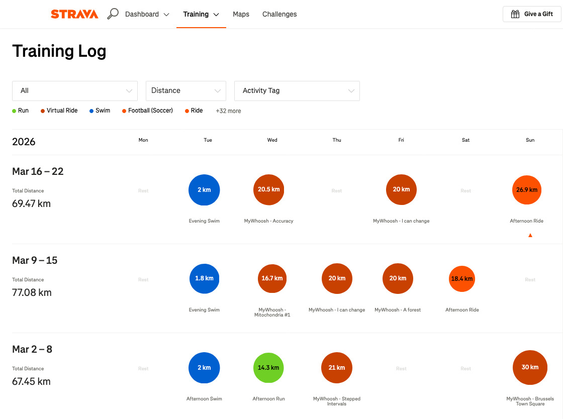 Không thể chạy bộ vì chấn thương, mình vẫn cố gắng duy trì lịch tập bơi và đạp xe như cũ nhằm duy trì thể lực. Các buổi bơi vẫn được duy trì vào thứ ba mỗi tuần. Còn các buổi đạp xe đã được tăng thêm thời lượng 3-4 buổi / tuần bù đắp cho các buổi chạy bị hủy.