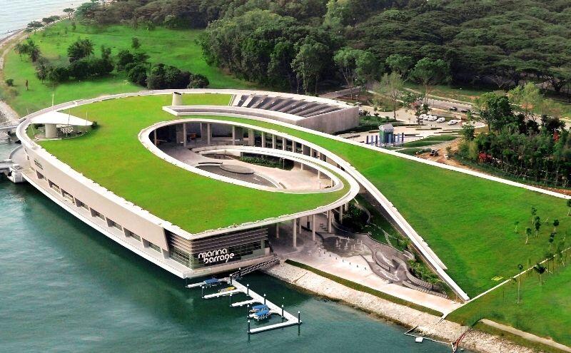 Men theo đường từ dưới chân cầu Helix Bridge, mình chạy thẳng vào trong đến một chỗ gọi là Marina Barrage. Cái này hình như là công trình thuỷ lợi gì đó, trước đây mình chưa ghé lần nào. Độc nhất là phần mái được trải thảm cỏ xanh, là địa điểm picnic, thả diều lý tưởng của người dân Singpore.