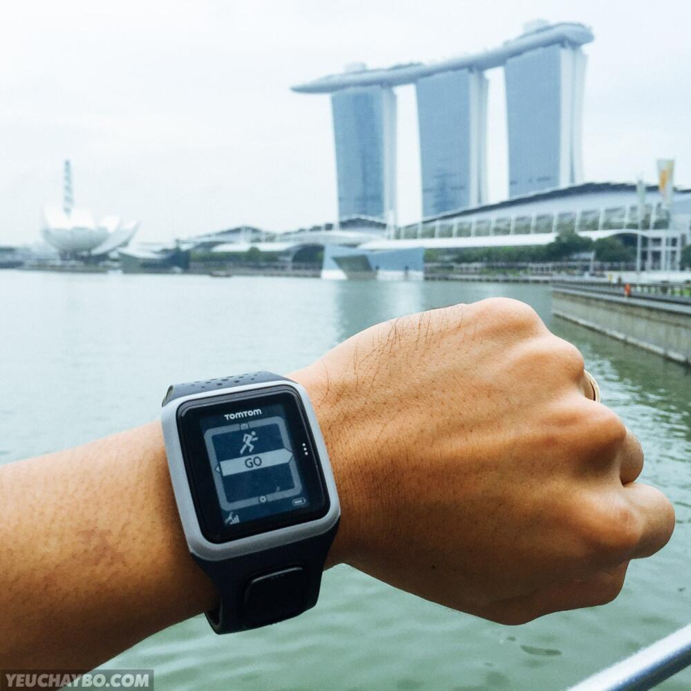 Căn hộ mình thuê nằm trong cao ốc The Sail Marina Bay, nhìn thẳng ra vịnh Marina nên chỉ cần băng qua đường là ra đến đường chạy. Khởi động 5 phút trong khi đợi TomTom kết nối GPS, xong là phóng ngay.