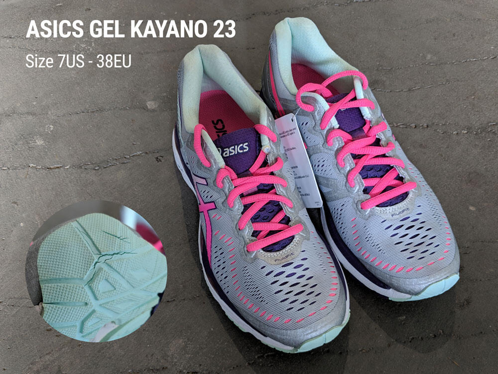 Giày nữ Asics GEL Kayano 23 (7US – 38EU): phần đế cao su ở mũi bị nứt.