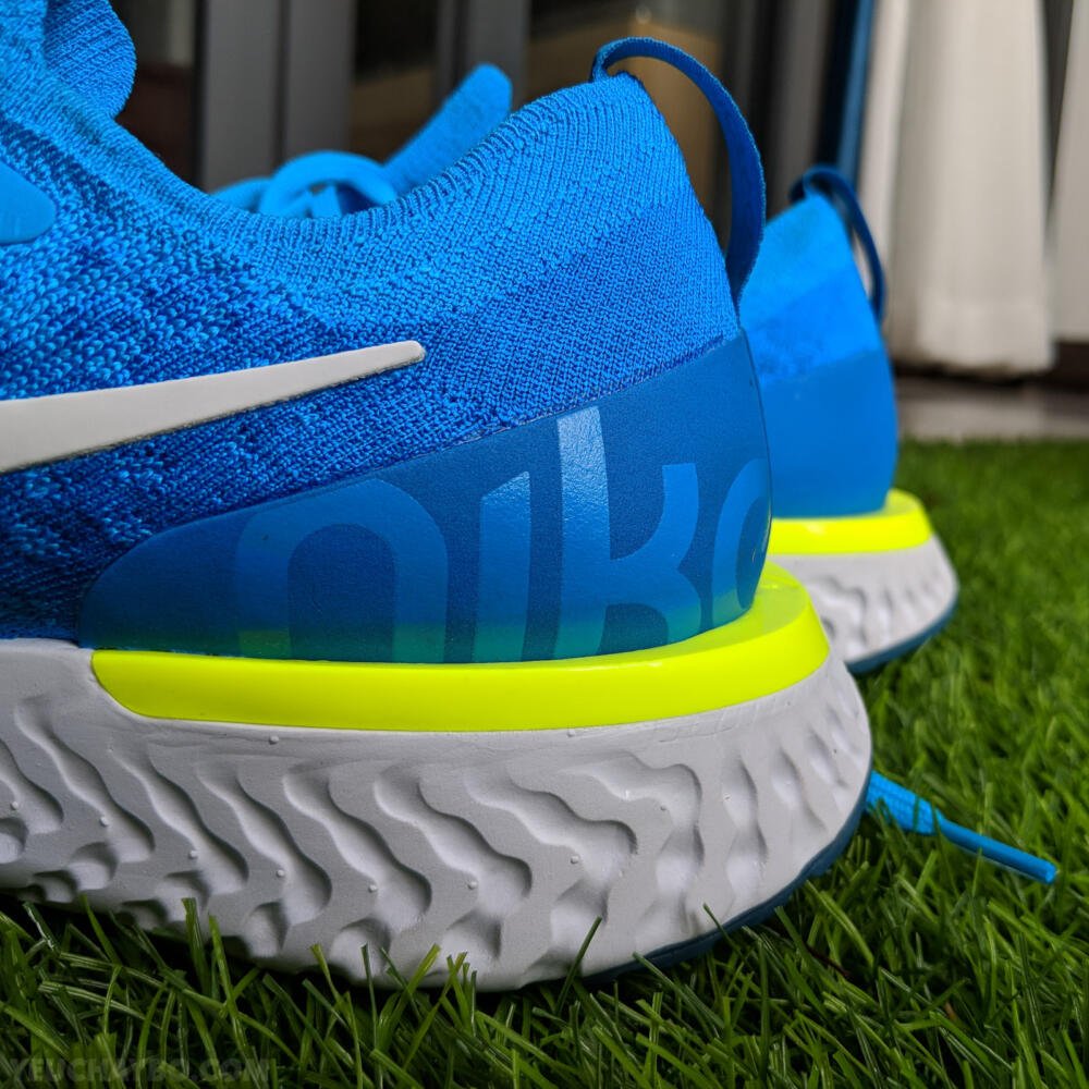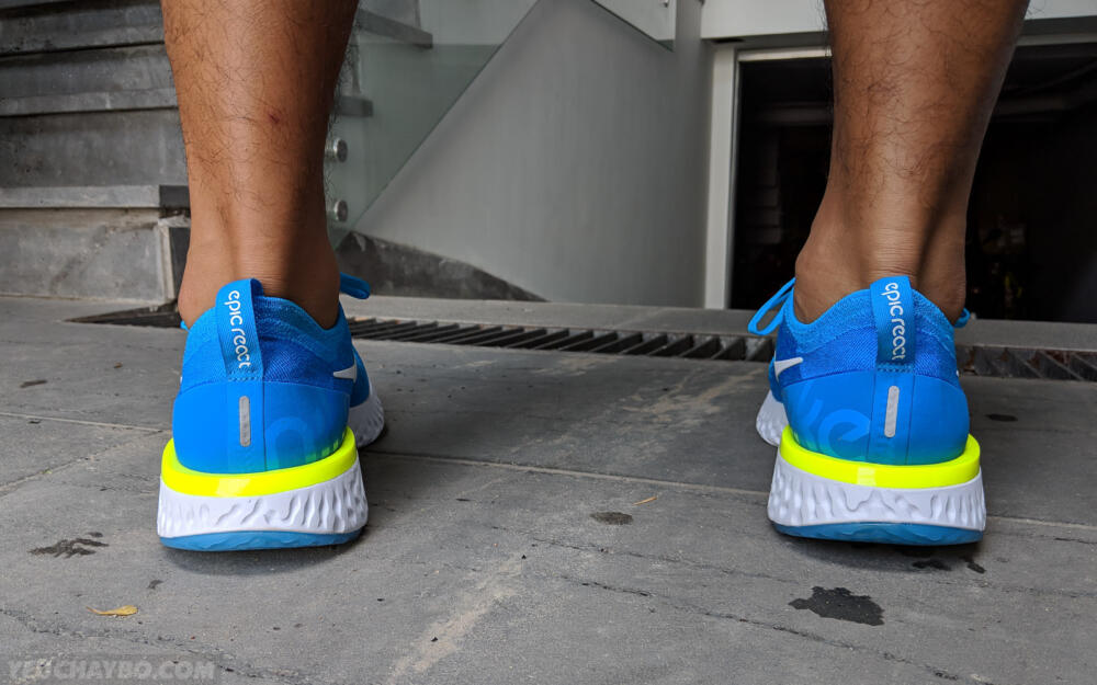Một trong những điểm nhấn độc đáo nhất của Nike Epic React là phần đế sau gót giày được làm rộng ra hai bên và kéo dài ra phía sau gần 1 cm so với thân giày.