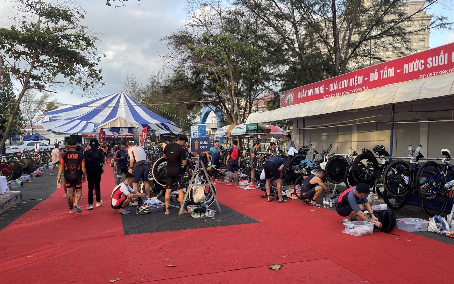 Mình di chuyển nhanh vào khu vực transition để chuẩn bị cho phần đạp. Xung quanh ai ai cũng vui vẻ phấn khởi sau khi sống sót qua được phần bơi.