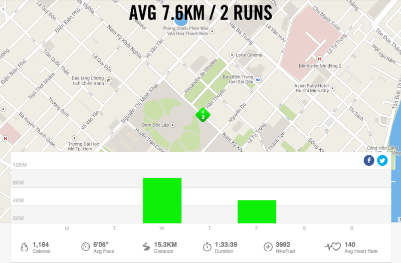 Vài tuần gần đây mình chủ yếu chuyển sang chạy ngoài đường để có sinh khí chinh phục các buổi chạy dài, vốn là một cực hình nếu chạy trên máy. Tuần trước cũng không là ngoại lệ. Hai buổi chạy thứ 4 và thứ 6 mình đều chạy lúc sáng sớm ở dinh Thống Nhất, địa điểm quen thuộc trong thời gian gần đây.